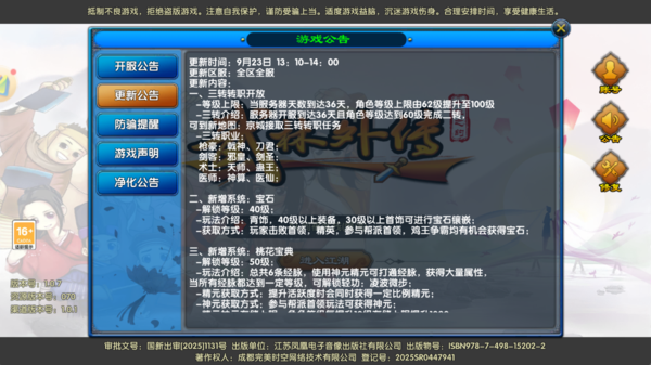 【更新公告】武林外传十年之约9月23日更新公告发表时间:2025-09-23 10:48 武林外传十年之约【更新公告】 更新时间:9月23日13:10-14:00 更新区服:全区全服 更新内容: 一、三转转职开放 等级上限:当服务器天数到达36天,角色等级上限由62级提升至100级 三转介绍:服务器开服到达36天且角色等级达到60级完成二转 可到新地图:京城接取三转转职任务 三转职业: 枪豪:戟神、刀君 剑客:邪皇、剑圣 术士:天师、蛊王 医师:神算、医仙 二、新增系统:宝石 解锁等级:40级 玩法介绍:背饰,40级以上装备,30级以上首饰可进行宝石镶嵌 获取方式:玩家击败首领,精英,参与帮派首领,鸡王争霸均有机会获得宝石 三、新增系统:桃花宝典 解锁等级:50级 玩法介绍:总共6条经脉,使用神元精元可打通经脉,获得大量属性, 当所有经脉都达到一定等级,可解锁轻功:凌波微步; 精元获取方式:提升活跃度时会同时获得一定比例精元; 神元获取方式:参与帮派首领玩法可获得神元; 精元神元存储上限:角色等级每提升10级存储上限提升1000; 四、新增地图内容 新增地图:京城、晨曦草原、南疆、鸣沙荒漠; 新增地宫:太古皇陵一层、太古皇陵二层、魔幻迷宫、囚龙谷; 新增装备品质:绝世(红色); 新增60~100级首领、精英、异兽; 新增60~90级装备; 新增70~90级宠物装备 五、玩法&功能调整 活动玩法奖励调整(每日累充奖励更新后生效,更新前达成并领取则无法获取新奖励) 日常任务中活动增加63~100级的的奖励配置 图鉴扩充60~100级怪物/装备图鉴 声望系统新增京城、晨曦草原、南疆、鸣沙荒漠声望捐献&兑换 武林之路新增京城、晨曦草原、南疆、鸣沙荒漠对应任务 打造系统新增60~90级装备打造 职业排行榜增加三转职业排行 主线任务新增60~100级内容; 首领刷新优化:野外精英/异兽调整为随机坐标刷新,当怪物刷新后,激活前往按钮 掉落调整: 1.低于世界等级15级的普通怪物掉落的道具优化为绑定道具(金钱,声望,材料装备) 2.首领、精英、异兽、地宫怪物及活动掉落不受此影响: